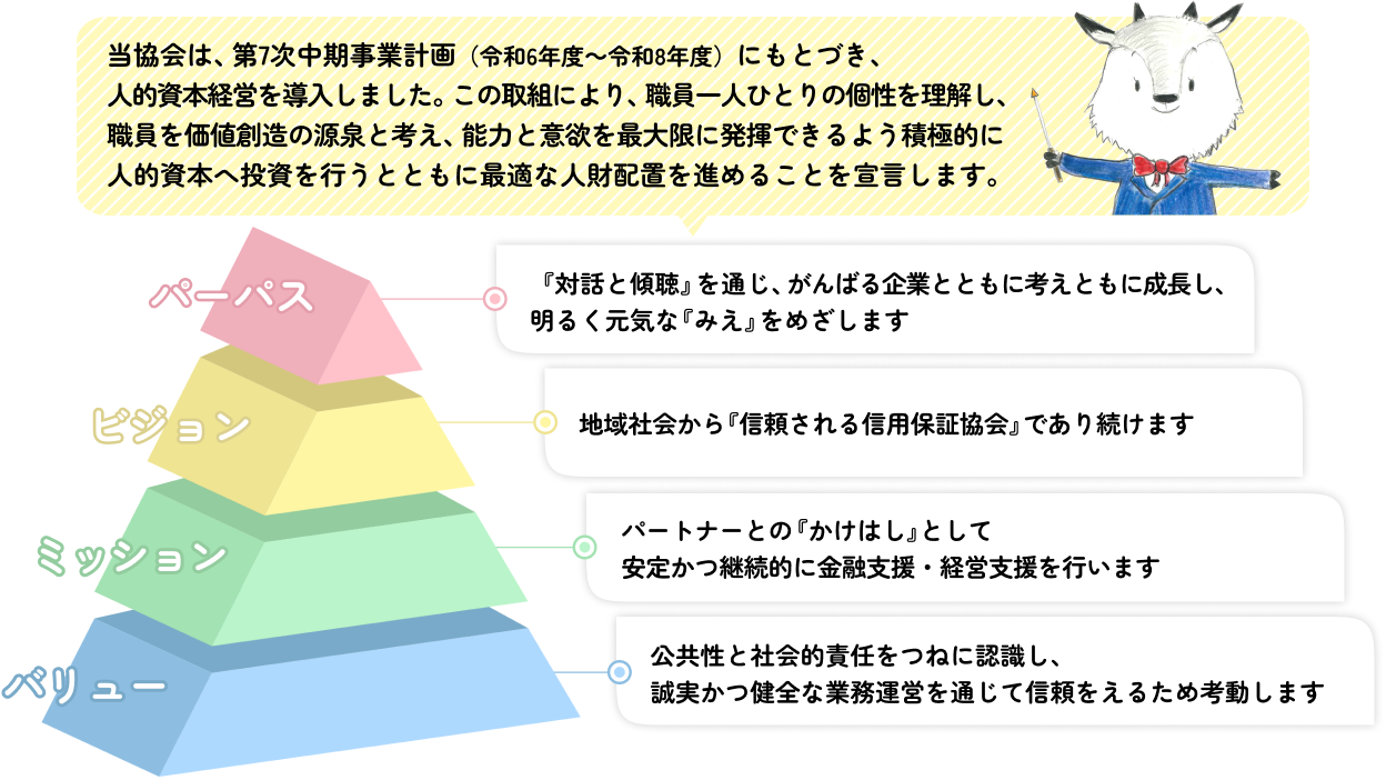 将来を担う人材の確保に努めながら職員一人ひとりの能力や価値を高めて組織力を強化し、質の高いサービスの提供を取り組むとともに、コンプライアンスを重視した経営の徹底と危機管理体制の充実に取り組み、健全な業務運営を目指します。