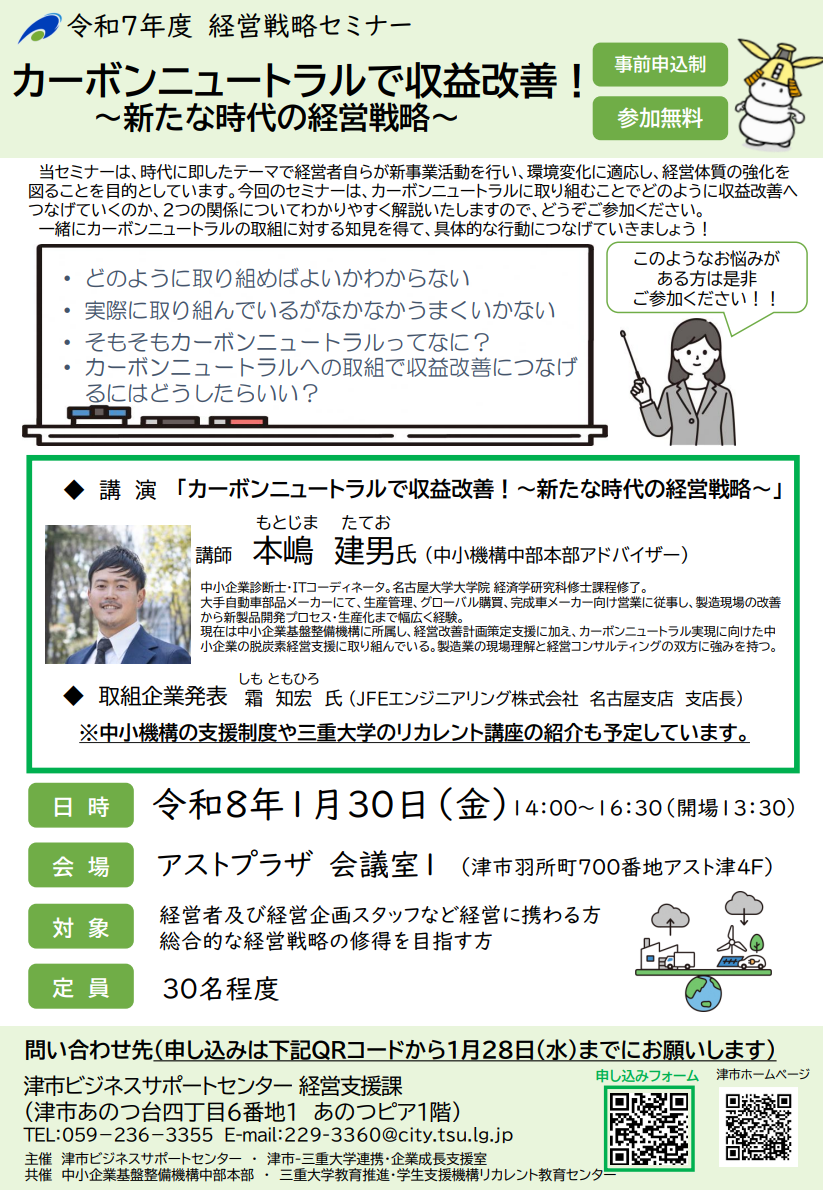 | 主催 | 津市ビジネスサポートセンター、津市-三重大学連携・企業成長支援室 |