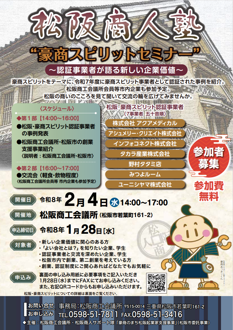 令和7年度に豪商スピリット事業者として認証された事例を紹介するセミナーが開催されます。松阪商工会議所会員等市内企業も参加予定です。